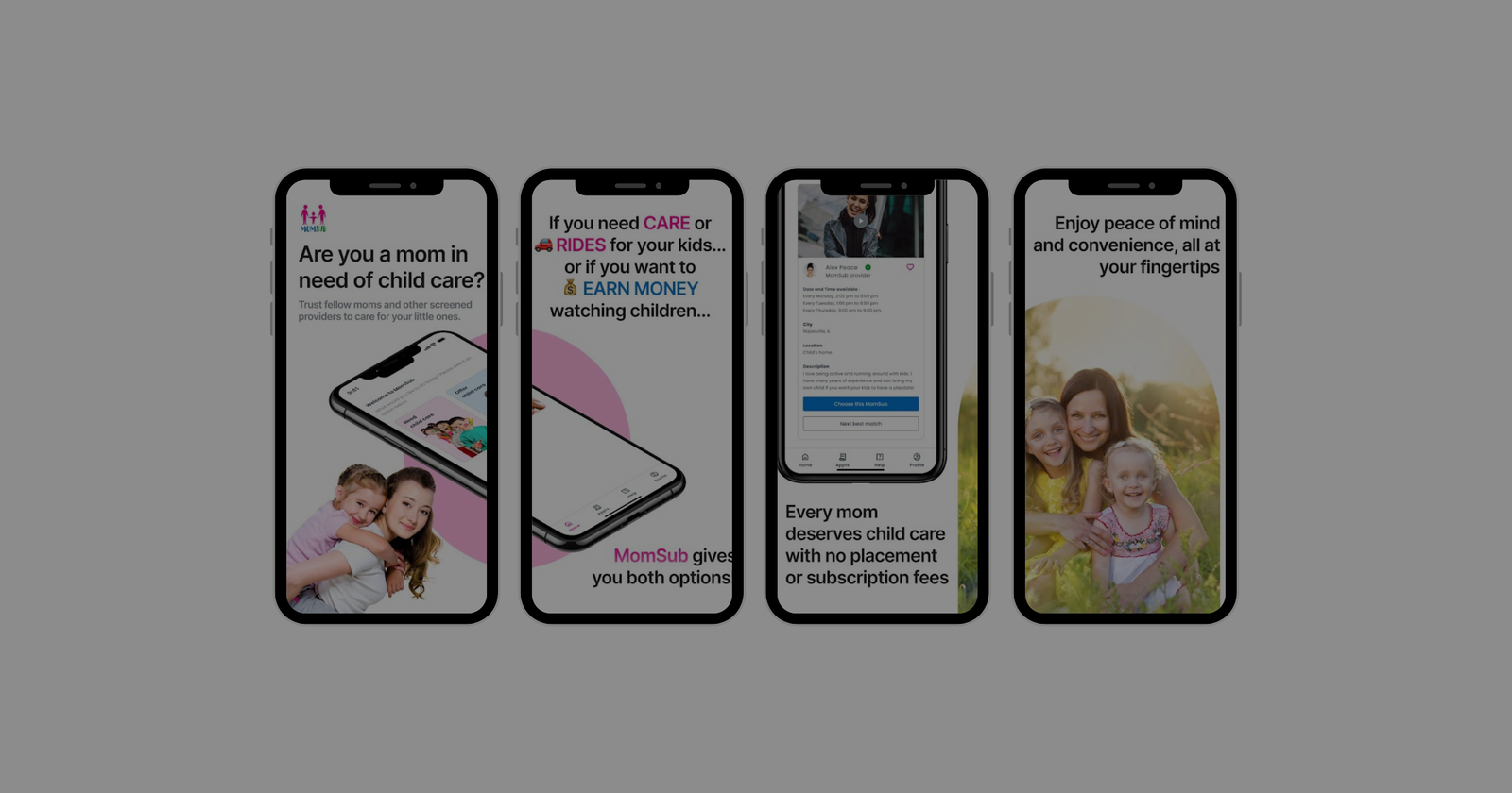 MomSub is a mobile platform that connects parents with verified childcare providers — helping families find, interview, book, and manage trusted caregivers quickly and safely. It significantly reduces the time, stress, and cost associated with traditional nanny searches by matching users to ideal care providers through a user-friendly algorithmic process.
